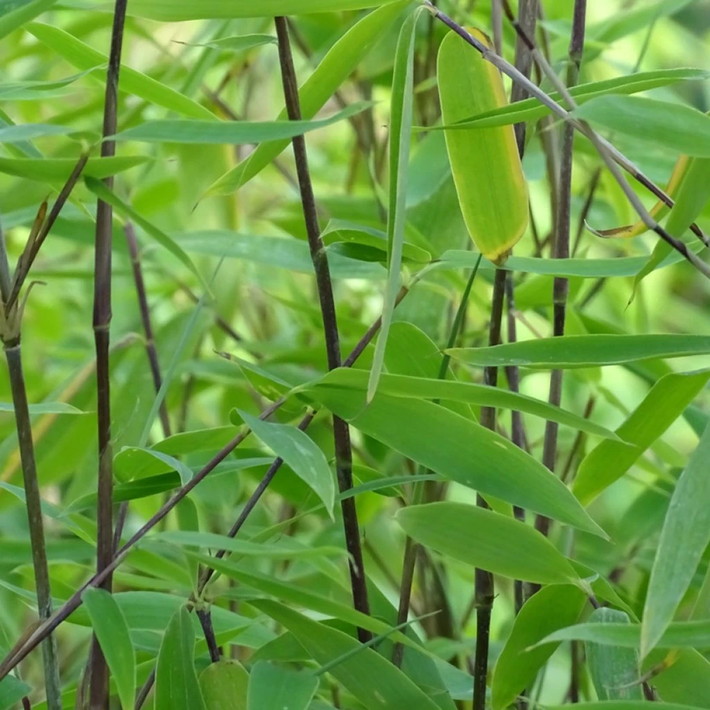 Le Fargesia Viking® est une plante de la famille des poacées, une sorte de graminée à tiges ligneuses qui se développe à partir d’une souche rhizomateuse non traçante, qualifiée de cespiteuse. Chez ce type de bambous, les rhizomes à entre-noeuds très courts se développent lentement à la périphérie de la souche qui s’élargit progressivement, mais reste dense, sans se dégarnir au centre. Viking® est une obtention horticole néerlandaise récente issue du croisement entre le F. murielae ‘Wilson’ et le F. nitida n°1. Ces plantes, originaires des montagnes chinoises, sont particulièrement résistantes au froid. Viking® forme une touffe bien dense de bas en haut, légèrement évasée, atteignant environ 3-4 m de hauteur, selon les conditions de culture. Avec le temps, son port devient légèrement retombant en haut de la touffe. Sa croissance est très rapide, de l’ordre de 40 à 50 cm par an au minimum. A terme, la plante s’étalera sur environ 2 m au sol. Les cannes ou chaumes sont si serrés qu’ils forment un écran vertical très dense, presque impénétrable. Ce sont des tiges dressées, fines, de 2 cm de diamètre mais solides. Couvertes de pruine et de couleur pourpre foncé lorsqu’elles sont jeunes, elles prennent une coloration plus brune au fil du temps. Le feuillage est persistant et réparti sur la moitié supérieure de la plante. Particulièrement abondantes, les feuilles sont de petite taille, étroites, lancéolées et effilées à leur extrémité. Leur teinte est un vert franc, au fini satiné. Les feuilles les plus âgées tombent tout au long de l’année, plus particulièrement en automne.